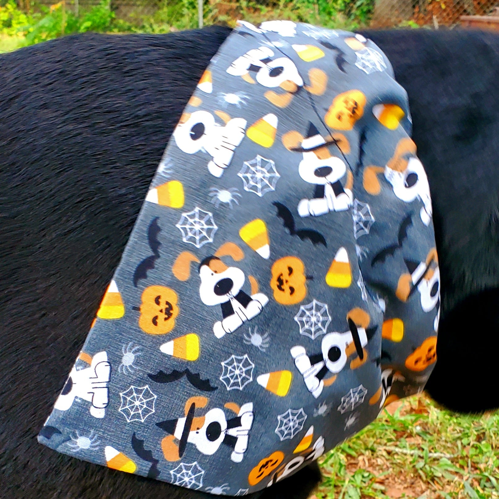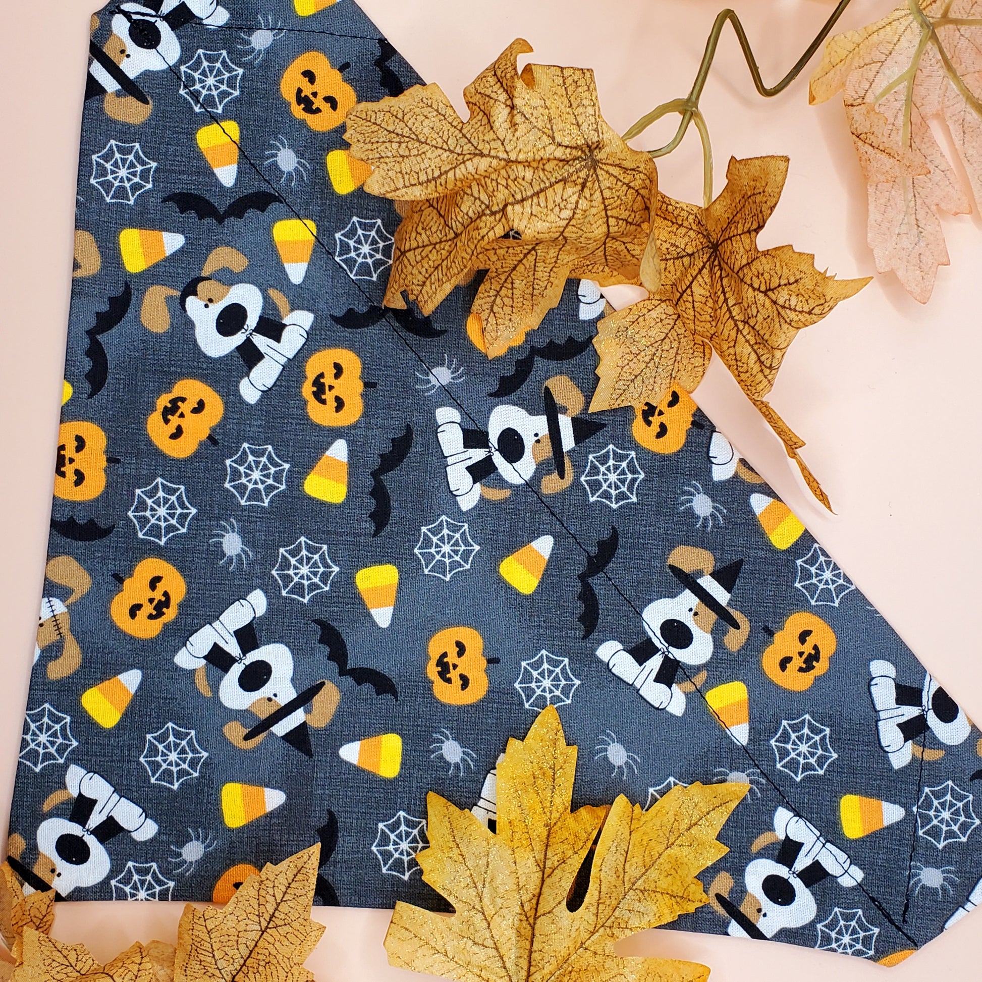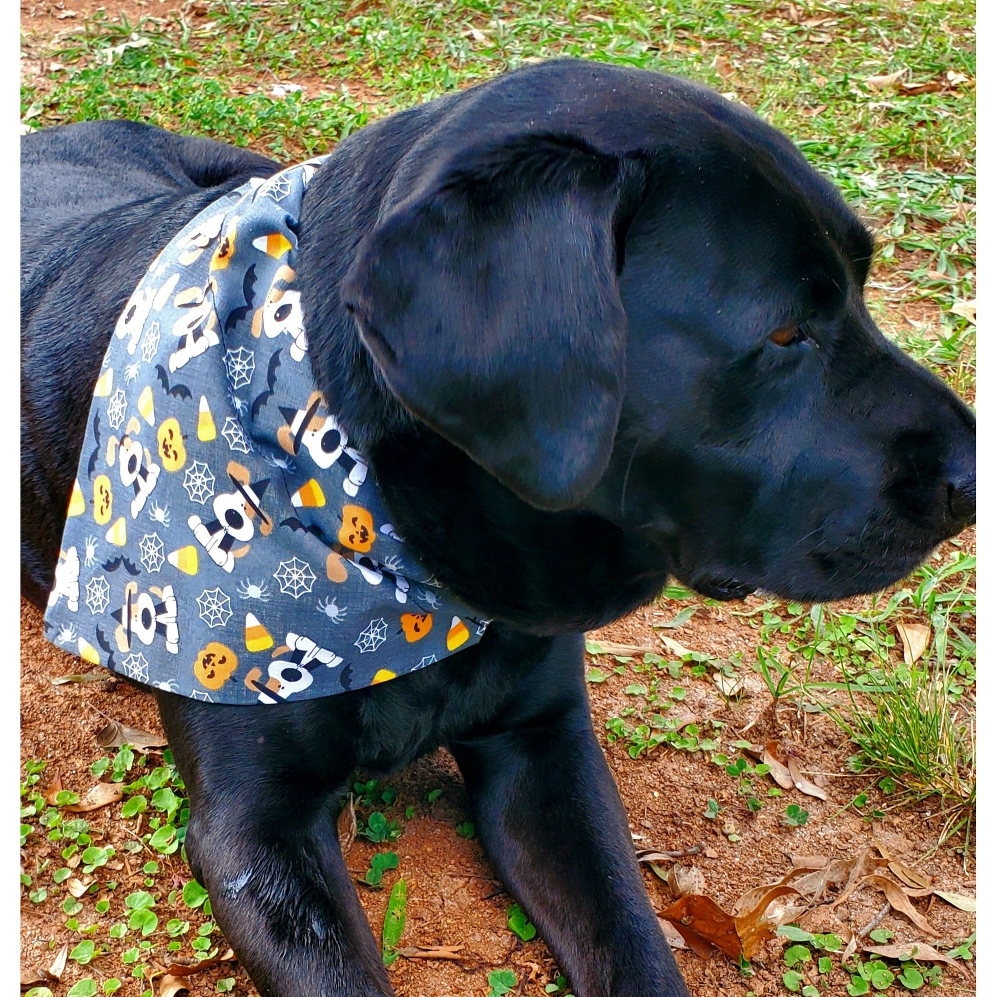 Your fur baby is handling Halloween business in a bandana featuring candy corn, bats, spider webs, and pumpkins!